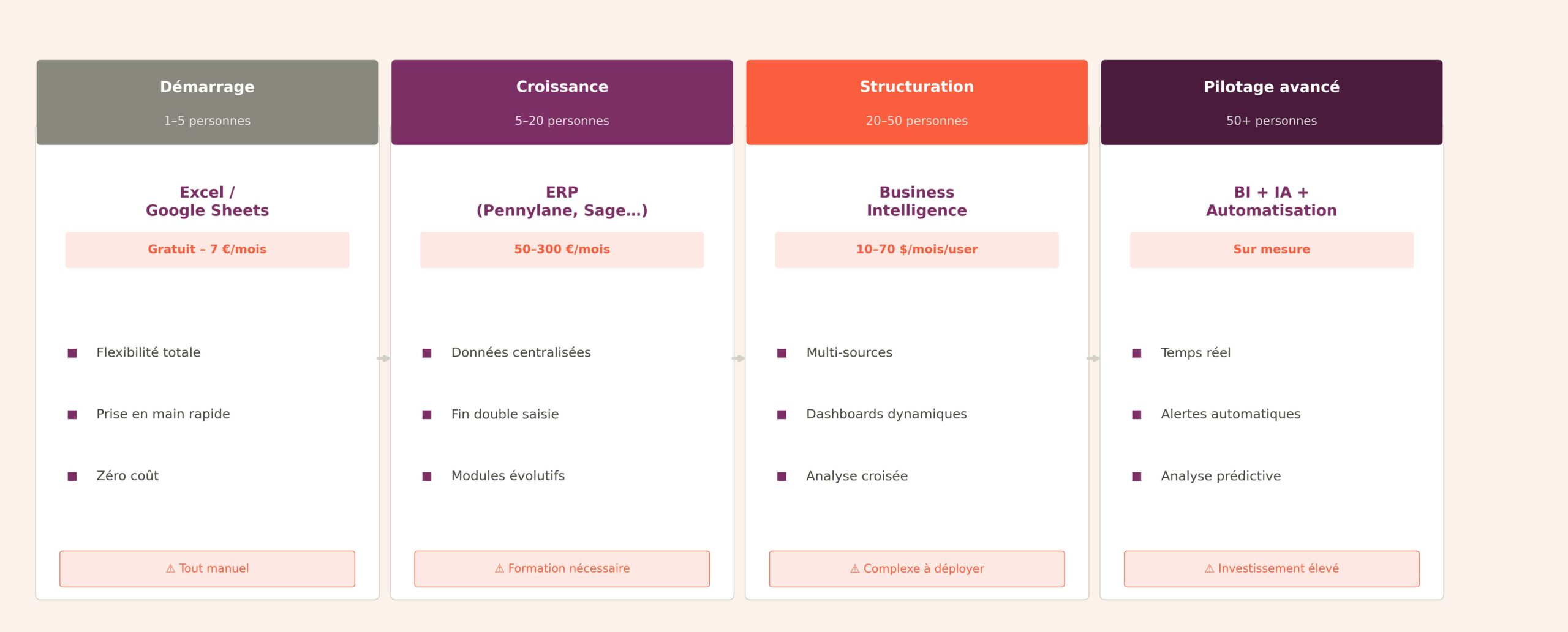 Piloter une entreprise c’est savoir « mesurer ». Et pour mesurer, vous avez besoin d’outils de pilotage adaptés à la taille de votre entreprise et à son stade de maturité. On ne pilote pas une startup de 5 personnes comme une PME de 50 salariés. La vraie question ? C’est de trouver le bon niveau de sophistication : ni trop simple – vous passeriez à côté de l’essentiel –, ni trop complexe – personne ne l’utilisera.